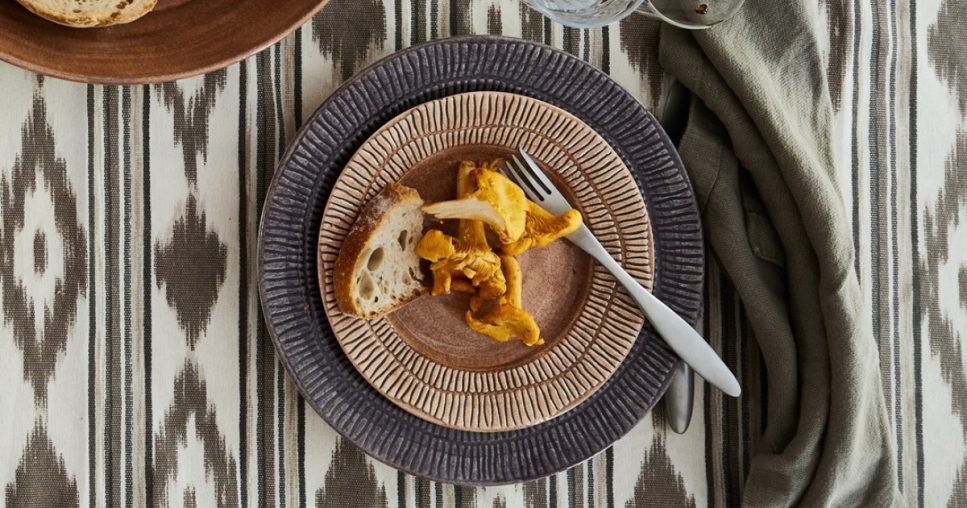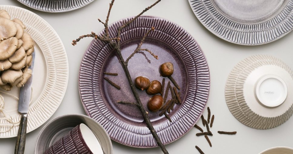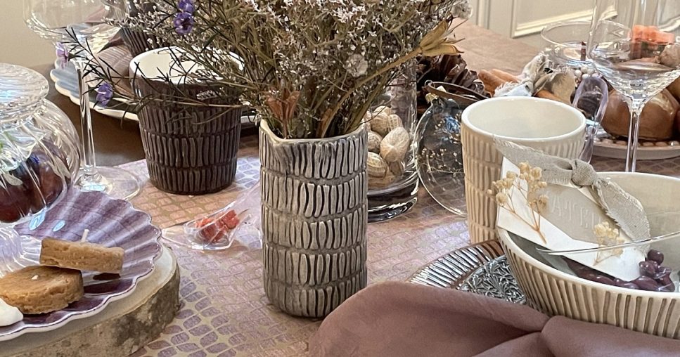 ふんわり柔らかな印象のシナモンとサンドの食器に、グリーンをプラスすることで、上品かつ温もりのあるテーブルコーディネートに。